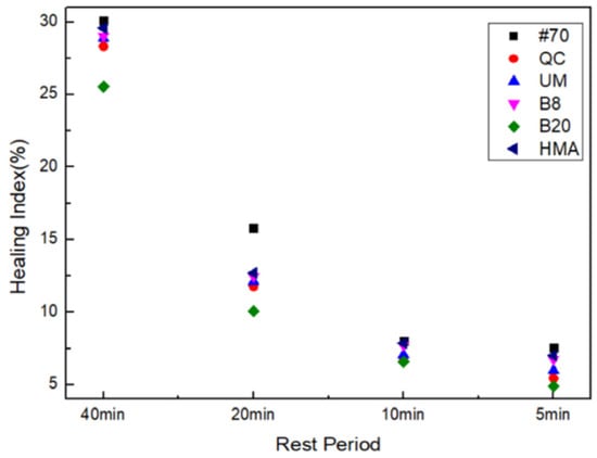 The healing index of asphalt FAM mixtures after freeze–thaw tests is shown in Figure 12.