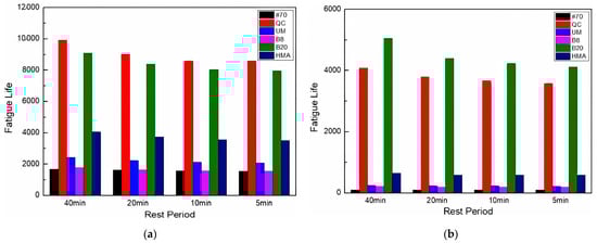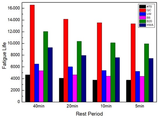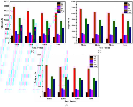 This study has examined the fatigue life of asphalt FAM mixes that take self-healing into consideration in order to provide a basis for the real service life of the pavement. The fatigue life of asphalt FAM mixes that included self-healing was calculated using Equations (5)–(7). Figure 7 shows the results.