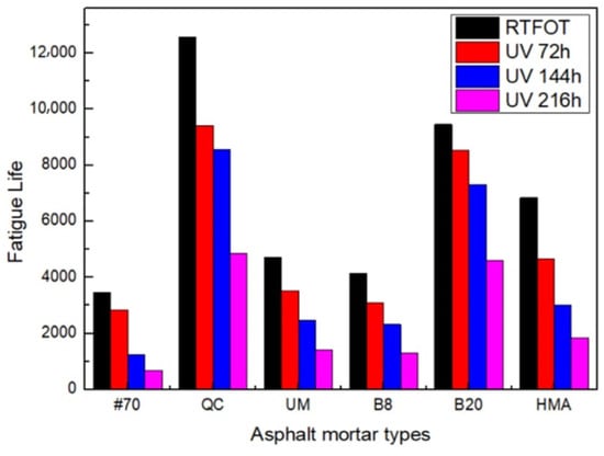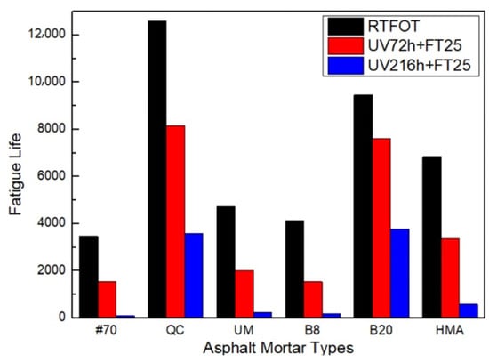 Figure 8 shows that the fatigue life of each asphalt FAM mixture is reduced after UV aging. The fatigue life of the #70 asphalt FAM mixture decreased most rapidly, with the fatigue life after 216 h of UV aging being only 20% of that after RTFOT. This is attributed to the sensitivity of aromatics and resins in asphalt to ultraviolet light, which easily undergo photo-oxidation reactions to form asphaltene, leading to the degradation of asphalt performance []. The increase in the effect of UV aging on the fatigue life of the asphalt FAM mixture was not simply linear. For example, the fatigue life of the 8% QC rock asphalt FAM mixture UV-aged for 144 h was 9.3% lower than that for 72 h, while the fatigue life of that UV-aged for 216 h was 43% lower than that for 144 h. At the same concentration of 8%, the fatigue life of the Buton rock asphalt FAM mixture decreased significantly. Compared to the fatigue lives of different concentrations of UV-aged Buton rock asphalt FAM mixtures, the effect of UV aging on the 20% Buton rock asphalt FAM mixture was smaller. Thus, it is shown that the fatigue life of rock asphalt FAM mixes became less affected by UV aging as the rock asphalt concentration increased. UV aging had the greatest impact on the fatigue performance of the HMA FAM mixture compared with other varieties of rock asphalt. From the above results, it can be observed that different types of asphalt exhibit variations in resistance to UV aging, which is attributed to differences in the content of aromatic compounds and resins in the asphalt [].