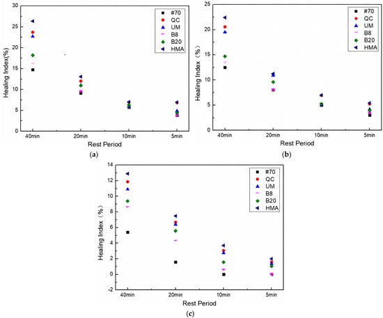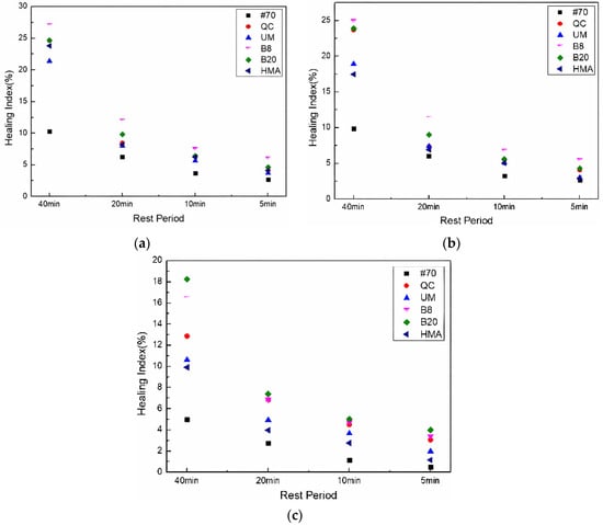 Healing index after UV aging. (a) UV aging for 72 h; (b) UV aging for 144 h; and (c) UV aging for 216 h.