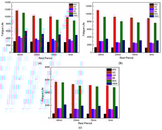 Figure 7 shows that the order of fatigue life of asphalt FAM mixtures had not changed after considering the influence of self-healing, indicating that although rock asphalt had a negative impact on the self-healing performance, the fatigue life considering self-healing of rock asphalt FAM mixtures was still higher than that of the #70 FAM mixture. Moreover, the QC rock asphalt FAM mixture still exhibited the longest fatigue life. Therefore, rock asphalt can be used as a more practical modifier in actual use to improve the service life of asphalt pavement.
