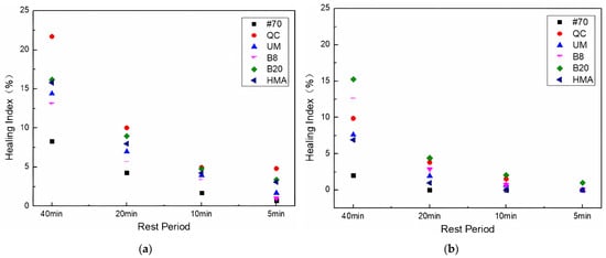 The self-healing properties of FAM mixtures were represented by the healing index (HI) calculated by Equation (8). Figure 6 shows the HI calculation results.