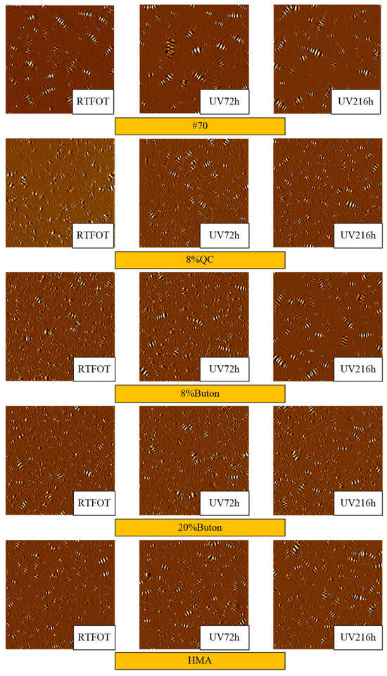 The #70 asphalt’s bee-structure had a more noticeable alteration following the same time of UV aging as the modified rock asphalt asphalts. Therefore, the fatigue performance of the rock asphalt FAM mixture after UV aging was weaker than that of the virgin asphalt FAM mixture. Similarly, the bee-structure of 20% Buton rock asphalt modified asphalt changed the smallest, which was affected the least during UV aging, so its fatigue performance was also the least affected.