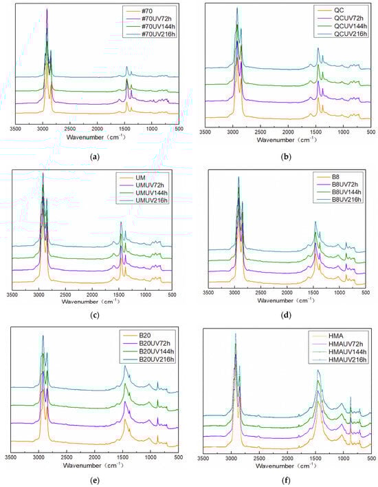 FTIR results. (a) #70; (b) QC; (c) UM; (d) B8; (e) B20; and (f) HMA.
