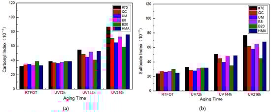 Figure 19 shows that the carbonyl and sulfoxide index of rock asphalt modified asphalt was higher than that of #70 asphalt after RTFOT. This is because rock asphalt is natural asphalt, which has undergone a long period of aging in the natural environment and has a high content of carbonyl and sulfoxide groups. After UV aging, the carbonyl and sulfoxide indexes in asphalt binders increased. After 216 h of UV aging, the carbonyl and sulfoxide index of #70 asphalt increased the most, by 171% and 220%, respectively. As the UV aging hours increased, the index also gradually increased. It can be seen that as the UV aging hours increased, the degree of aging increased. In addition, the carbonyl index and sulfoxide index of the rock asphalt modified asphalt were lower than those of the #70 asphalt after UV aging, which proved that under the same UV aging hours, the aging degree of the #70 asphalt was higher than that of the rock asphalt modified asphalt. Therefore, the fatigue life and healing index of rock asphalt FAM mixtures were less affected than that of #70 asphalt FAM mixtures, corresponding to the fatigue and self-healing performance. The 20% Buton rock asphalt modified asphalt had the lowest carbonyl and sulfoxide index after UV aging by 52% and 50%, respectively, so the fatigue life and healing index of the 20% Buton asphalt FAM mixture were affected the least by UV aging.