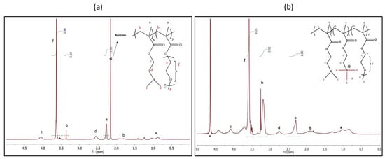 1H-NMR spectra for (a) P(DMAEMA-co-OEGMA) random copolymer in deuterated chloroform (CDCl3) * (7.3 ppm, not shown) and (b) Q_P(DMAEMA-co-OEGMA) copolymer in deuterated water (D2O) *.