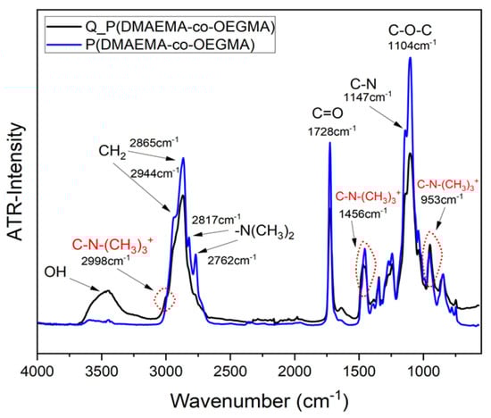ATR–FTIR spectra of P(DMAEMA-co-OEGMA) copolymer and Q_P(DMAEMA-co-OEGMA) copolymer (black line) in comparison to its precursor (blue line).