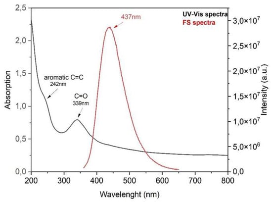 Further spectroscopic studies revealed the fluorescence properties of the CDs caused by the fluorophore citrazinic acid derivative, IPCA. Figure 3 shows the absorption and photoluminescence spectra, in correlation, obtained through UV-Vis and PL spectroscopies. The absorption spectrum shows a shoulder at 242 nm and a broader peak at 339 nm, assigned to π–π* transitions of sp2-hybridized carbon and n–π* transitions at the edge of the carbon lattice, respectively. On the photoluminescence emission spectrum, a high intensity peak is observed at 437 nm, originating from excitation at 340 nm and attributed to n–π* transitions at the CD edge [28]. This strong emissive effect stems from the molecular fluorophore in relation to the citrazinic acid. The excitation area was chosen in correspondence with the absorption spectrum and the strong peak obtained.