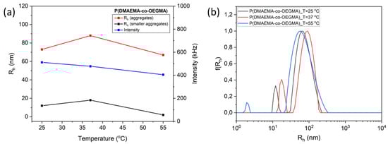 In order to record any phase transitions and increased hydrophobicity, dynamic light scattering measurements were carried out in function with the temperature of the copolymer solution. The obtained results (Figure 4) showcase a relatively weak thermo-responsive behavior of the copolymer system, which is justified by its low content of DMAEMA segments (36%), which is related to the small molecular weight of the PDMAEMA homopolymer. As mentioned before, the DMAEMA component is highly responsive to temperature changes when incorporated in the polymer chain, whereas the dominant OEGMA component adds colloidal stability to the copolymer system. Notably, it is observed that the nanoparticles’ dispersity index takes relatively high values, particularly at 25 °C and 37 °C, indicating the heterogeneity of the existing populations in solution. Populations of smaller sizes, evident in Figure 4b, are attributed to the presence of single chains of the copolymer in the solution or smaller-size aggregates incorporating a small number of chains. Furthermore, as shown in Figure 4a and Table S2, a slight increase in hydrophobicity and, therefore, in hydrodynamic radius is observed at 37 °C (18 nm/88 nm), a temperature near the LCST of PDMAEMA, for both populations. This means that close to this temperature, the above-mentioned copolymer succumbs to further intramolecular self-folding, forming aggregates of slightly increased size. By further increasing the temperature to 55 °C, the sizes decrease (2 nm/67 nm), most likely due to chain shrinkage or the breaking of the aggregates into smaller-sized nanostructures. Moreover, as the temperature gradually increases, scattered intensity values tend to slightly decrease, following the multichain aggregates’ mass reduction.