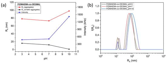 (a) Variation in scattered intensity and hydrodynamic radius of P(DMAEMA-co-OEGMA) and (b) size distributions from CONTIN analysis at pH 3, 7, and 10, extracted from DLS measurements.