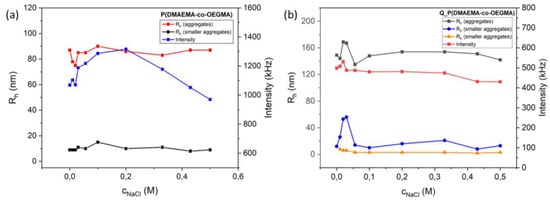 Concerning Q_P(DMAEMA-co-OEGMA) (Figure 6b), when dissolved in an aqueous solution (in the absence of salt), it forms aggregates of different sizes (Rh = 12/149 nm) and masses (I = 498 kHz) compared to the double-hydrophilic copolymer precursor. Therefore, modification through quaternization creates larger aggregates with improved homogeneity (PDI = 0.257). At a salt concentration of [NaCl] < 0.02 M, the scattered intensity slightly increases, accompanied by an increase in the hydrodynamic radius, indicating the further aggregation of the system. Subsequently, the next salt additions ([NaCl] > 0.03 M) cause a decrease in the nanoparticles’ size and mass, as the aggregates presumably somewhat disintegrate. Thereafter, scattered intensity and hydrodynamic radius remain relatively constant.