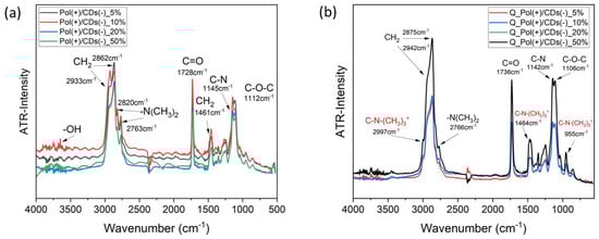 ATR-FTIR spectra of (a) P(DMAEMA-co-OEGMA)/CD and (b) Q_P(DMAEMA-co-OEGMA)/CD hybrid complexes.