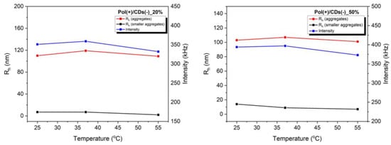 In order to examine the extent of temperature variations’ influence on the physicochemical characteristics of the hybrid complexes, DLS measurements were conducted at neutral pH and different temperatures. The results are summarized in Table S3. The hydrodynamic radius and scattered intensity values show the moderately weak thermo-responsive behavior of the hybrid systems, which corresponds to the behavior of the double-hydrophilic copolymer. Notably, at the 20% and 50% ratios, minor differences are evident regarding the scattered intensity and hydrodynamic radius of the nanoparticles. Namely, the maximum value for both characteristics appears at 37 °C, which is justified by the copolymer’s tendency for agglomeration near the LCST. Figure 8 displays the overall stability of the hybrid complexes for the selected ratios of CDs (20%, 50%) to temperature changes. It is also observed that the dispersity index of the samples decreases at higher concentration of CDs, meaning that the system’s homogeneity is improved and the structure of the complexes is better defined. Moreover, as shown in Figure S5, size distributions of the complexes formed at 20% CDs are not significantly affected by the temperature variations; hence, in this case, the system is quite indifferent to this parameter. Nevertheless, the complexes show wide size distributions due to the increased heterogeneity (PDI = 0.384, pH = 7), regardless of temperature. On the other hand, at 50%, CD heating at 55 °C leads to enhanced homogeneity (PDI = 0.289), as the size distribution of the sample becomes narrower. Peaks observed at smaller sizes are attributed to free copolymer chains, unattached CDs, or maybe complexes of smaller sizes.