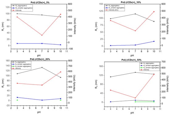 Variation in scattered intensity and hydrodynamic radius of P(DMAEMA-co-OEGMA)/CD hybrid complexes at pH 3, 7, and 10 extracted from DLS measurements.