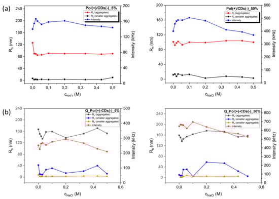 Concerning Q_P(DMAEMA-co-OEGMA)/CD hybrid complexes (Figure 10b), the study of the effect of salt concentration on their solutions was deemed useful, as QPDMAEMA behaves as a strong cationic polyelectrolyte. In total, no significant changes in the size or mass of the complexes were observed, with the exception of those at the 50% ratio of CDs. In this case, a minor decrease in scattered intensity was detected after the consecutive additions, probably due to breakdown of the hybrid nanostructures. The reasons for this behavior are unclear. In addition, two smaller-sized populations are also present, attributed to free chains or smaller hybrid complexes.