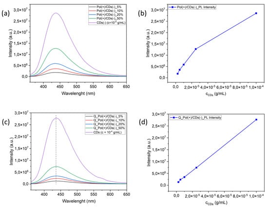 Correspondingly, the contribution of the CDs to the photoluminescence of the complexes is depicted in the FS spectra (Figure 11). As anticipated, the fluorescence intensity of the samples increases in an almost linear way by increasing the concentration of the CDs. In comparison, Q_P(DMAEMA-co-OEGMA)/CD hybrid complexes showed significantly lower fluorescence intensity, probably due to the presence of ammonium/iodine ions, which may act as quenchers of fluorescence.
