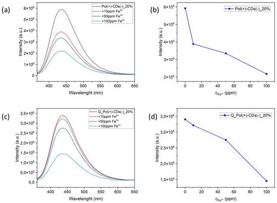 Lastly, the interest of this study focused on the potential interaction of the obtained hybrid complexes with metal ions in solution. The photoluminescence properties and characteristic functional groups on the surface of CDs allow for the detection of biologically relevant metal ions through resonance [31]. Based on the photoluminescence profile that can be affected by surface group changes, fluorescent CDs can become high-performance nanosensors via various synthetic routes, which include electrochemical etching, microwave and ultrasonic shearing, and pyrolysis. Ref. [32] In this context, the interaction of the prepared hybrid complexes with ferric ions was investigated. Two systems were selected, the hybrid complexes P(DMAEMA-co-OEGMA)/CD and Q_P(DMAEMA-co-OEGMA)/CD, at ratios of 20% in CDs based on the colloidal stability of complexes over time (Figure S7). Small amounts of a dilute solution of FeCl3 were added to the solutions of the hybrid complexes, and, afterwards, the samples were studied through FS spectroscopy. The results of these measurements (Figure 12) show that increased iron concentration in the aqueous solution results in gradually lower fluorescence intensity. Thus, the copolymer/CD complexes can be considered useful for the detection of metal ions in aqueous solution.