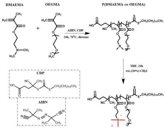 Scheme for P(DMAEMA-co-OEGMA) copolymer synthesis via RAFT polymerization and chemical modification of P(DMAEMA-co-OEGMA) with methyl iodide (CH3I).