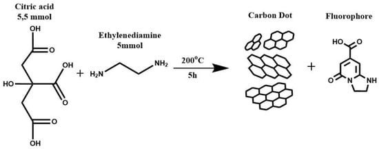 CD synthesis was conducted according to a standard hydrothermal procedure. Citric acid (9.77 g, 5.5 mmol) and ethylenediamine (3.11 mL, 5 mmol) were dissolved in 100 mL of deionized water in a Teflon liner. The Teflon liner was then placed in an autoclave device and held at 200 °C for 5 h. When the autoclave was cooled at room temperature, the product was filtered under vacuum, using water and a minimum amount of methanol as the solvent. The final product was stored in a vial and dried in a vacuum dryer.