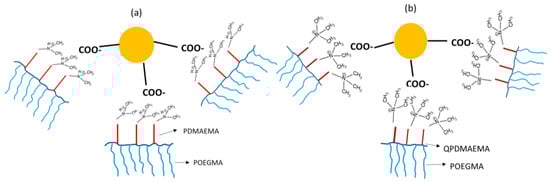 Temperature changes can drastically affect certain characteristics, such as morphological configuration, solubility, and self-assembly behavior, of stimuli-responsive polymers, which usually consist of hydrophilic and hydrophobic segments [18]. Therefore, in such systems, the main study concerns the hydrophilicity changes as a consequence of temperature changes. Polymers capable of phase transition, according to their solubility, might have lower critical solution temperature (LCST), meaning that below this temperature, the system shows increased solubility and homogeneity in water, while induced hydrophobicity and phase separation occur when heating above this critical condition [30]. In this case, the PDMAEMA homopolymer has an LSCT in the range of 40–50 °C, hence showing highly responsive behavior to temperature changes around this temperature range. The phase separation that occurs in such cases is strongly dependent on the molecular weight of the homopolymer and certain conditions, such as the pH and the salt content. On the other hand, the POEGMA homopolymer, with LCST at above 90 °C, provides enhanced hydrophilicity and shielding properties [24,25].