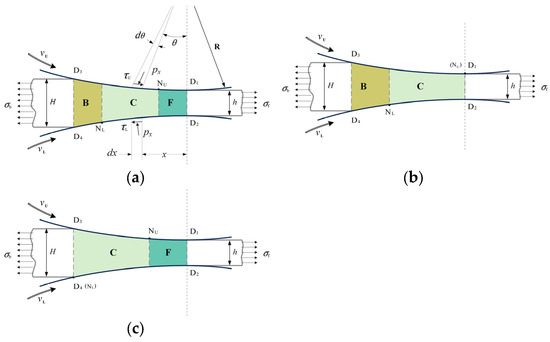 Schematic of deformation region states in asymmetrical strip rolling: (a) B+C+F, (b) B+C, and (c) C+F.