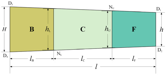 Figure 3 shows a schematic of the simplified geometry of the plastic deformation region in the asymmetrical rolling of strips. The projected contact lengths of the backward-slip zone, the cross-shear zone, and the forward-slip zone are denoted by , , and , respectively. The percentages of three zones are expressed as: