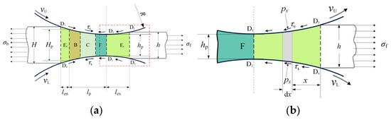 By substituting Equations (8) and (9) into Equation (7), and can be obtained. Then, can be determined from Equation (7) and . The roll pressures for the deformation region state B+C+F (Figure 1a) can be expressed as follows: