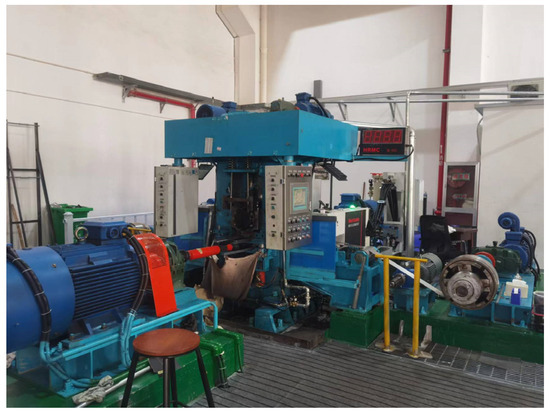 Experimental rolling was carried out on the four-high reversing mill shown in Figure 5. The diameter of the work roll is 90 mm, and the work rolls are driven separately. The maximum allowable roll force is 800 kN. Measured values of roll force, roll torque, roll speed, and strip thickness can be obtained using the equipped apparatus. In the experiment, work rolls with a diameter of 90.0 mm were employed, with the lower (slow) roll speed set at 4.0 m/min. Stainless steel (430) strips, with a thickness of 0.06 mm and 0.07 mm and a width of 120 mm, were rolled with emulsion lubrication.