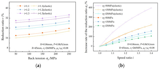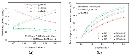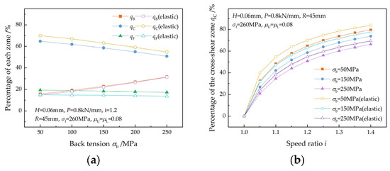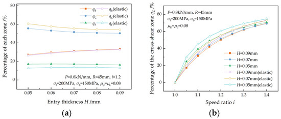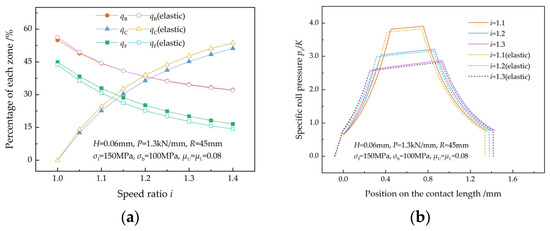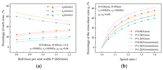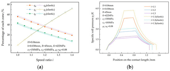 Figure 6 illustrates the effect of the speed ratio on the percentages of the three zones and specific roll pressures in the case of an equal reduction ratio. As can be seen from Figure 6a, and decrease as the speed ratio increases, while increases with the speed ratio. This trend was also found in the research of Sun et al. [7]. An increase in the speed ratio results in the movements of the upper and lower neutral points towards the exit and entry of the deformation region, respectively. Consequently, there is an increase in and a decrease in and . As a result of the elastic deformation of the strip, increases, decreases, and remains unchanged. When there are elastic zones, friction in elastic zones results in a reduction in the front and back tension acting on the plastic deformation region. Since the reduction in the front tension is greater than that in the back tension, both the upper and lower neutral points move towards the exit of the deformation region. As a result, the percentage of the forward-slip zone decreases, and the percentage of the backward-slip zone increases. As the speed ratio increases, the average specific roll pressure decreases because of the increase in (Figure 6b). This is in accordance with the findings of Sun et al. [7] and Tian et al. [8]. More thickness reduction is required to achieve the desired exit thickness because of the elastic recovery of the strip, resulting in a higher specific roll pressure.
