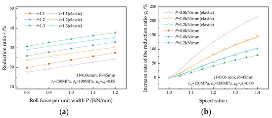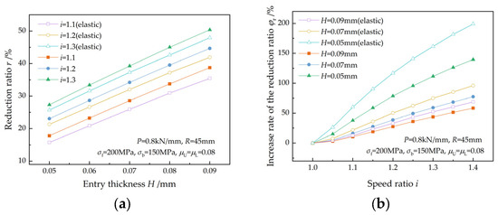 Figure 17 shows the effect of roll force on the reduction ratio. The reduction ratio increases with the roll force (Figure 17a), which is in agreement with Salimi et al. [2], Hwang et al. [5], and Tian et al. [8]. The reduction ratio increases faster at a lower roll force as the speed ratio increases because of a higher increase rate of (Figure 17b). This is in agreement with the research result of Sun et al. [7]. The elastic deformation of the strip leads to a lower reduction ratio but a higher increase rate of the reduction ratio.