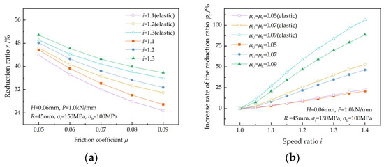 Effects of the friction coefficient on (a) the reduction ratio and (b) the increase rate of the reduction ratio at different speed ratios.