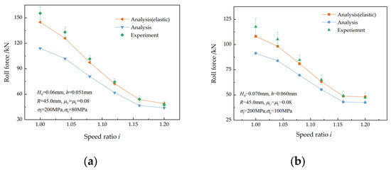 Figure 18 shows a comparison of the experimental roll forces with the analytical values for two ultra-thin strips. The 0.06 mm thick strips were rolled to 0.051 mm with different speed ratios. The calculated and measured roll forces are shown in Figure 18a. As the speed ratio increases, both the analytical and experimental roll forces decrease. This has been reported in references [2,3,7]. A maximum error of 7.2% is found between the experimental and analytical roll forces when the elastic deformation of the strip is taken into account, but the maximum error surges to 36.2% when the elastic deformation of the strip is ignored. The 0.07 mm thick strips were rolled to 0.06 mm in another rolling experiment, and Figure 18b shows the calculated and measured roll forces. The maximum error between the experimental and analytical roll forces is 8.9% when the elastic deformation of the strip is considered, but the maximum error is 28.7% when the elastic deformation of the strip is ignored.