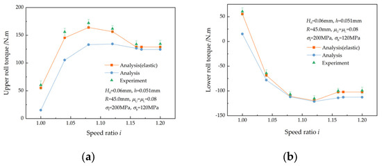 Comparisons of roll torques between the analytical and experimental results: (a) the upper roll torque and (b) the lower roll torque.