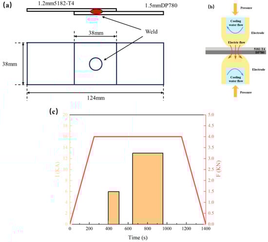 Schematic illustration of the RSW process: (a) overlap specimens and the welding position, (b) the schematic of resistant spot welding (RSW), and (c) welding schedule.