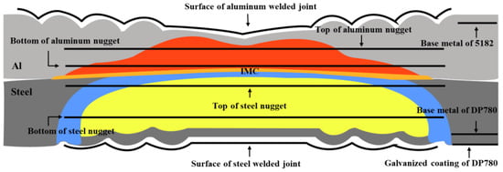 To reduce fuel and battery consumption in a cost- and environmentally effective way, the usage of lightweight and advanced materials in hybrid body structures is becoming a important strategy in the automotive industry [1,2]. Aluminum (Al) alloys and high-strength steels, as two typical materials, have huge differences in physical and metallurgical properties, leading to a challenge in establishing reliable joining techniques [3,4,5]. In many joining techniques, resistance spot welding (RSW) is one of the most promising candidates due to its high flexibility and efficiency [6,7]. The high tensile and fatigue properties of the Al alloy/steel joints can be achieved by using the optimized RSW joining technique [8,9,10]. However, the Al alloy/steel RSW joint is still susceptible to corrosion and joint strength degradation in an aggressive environment due to the complicated microstructure and intrinsic differences in the electrochemical corrosion properties at the joint interface [11,12]. Therefore, the corrosion behavior must be understood to ensure the reliable employment of the Al alloy/steel RSW technique.