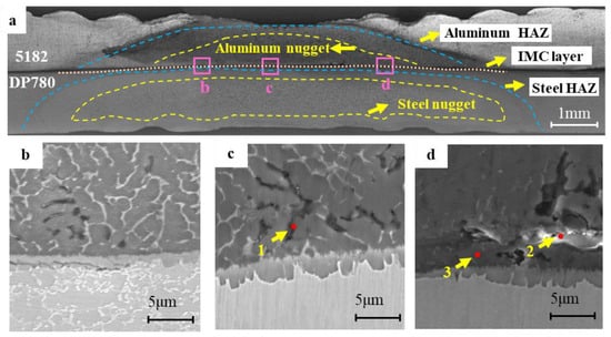 Microstructure characteristic of 5182/DP780 RSW joint, (a) the cross-sectional microstructure of the RSW joint (b) the microstructure of the interface at position b, (c) the microstructure of the interface at position c, and (d) the microstructure of the interface at position d.