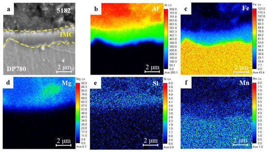 Figure 4 shows the EPMA element distribution of the IMC layer at the nugget center of the 5182 aluminum/DP780 steel RSW joint. Compared to the Al nugget (redness region in Figure 4b), two regions in green and blue seem to be observed at the interface IMC layer. Such regions are coincidental to the regions in blue and green of Fe mapping in Figure 4c, respectively. The EPMA element mapping results in this paper were consistent with the previous research about the elemental distribution of steel/aluminum IMC by EDS and the EBSD phase map [31,32]. According to the atomic ratio [33,34,35,36,37,38], the two layers of the interfacial IMC are FeAl3 and Fe2Al5, respectively. The Mg is found only on the aluminum side (Figure 4d). A slight amount of Mn element seems to be visible in Figure 4f, while slight enrichment in Si element can be carefully identified in Figure 4e. These elements play a crucial role in controlling the growth of interfacial intermetallic compounds [39,40,41,42,43].