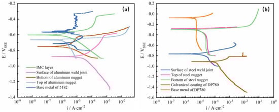 Potentiodynamic polarization curves in a 3.5 wt. % NaCl solution for different localized layers within the RSW joints of 5182 aluminum alloy and DP780 galvanized steel from the fracture samples. (a) The 5182 aluminum alloy side; (b) the DP780 galvanized steel side.
