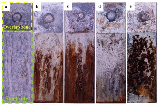 Corrosion morphologies of the overlap zones on the steel side after salt spray exposure at different times (a) 72 h, (b) 240 h, (c) 480 h, (d) 720 h, and (e) 1080 h.