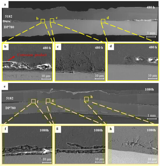 Cross-sectional microstructure of 5182/DP780 RSW joint after salt spray exposure of different times: (a) macrostructure of cross-section after salt spray exposure of 480 h; (b) microstructure at position b; (c) microstructure at point c; (d) microstructure at point d; (e) macrostructure of cross-section after salt spray exposure of 1080 h; (f) microstructure at point f; (g) microstructure at point g; (h) microstructure at point h.