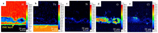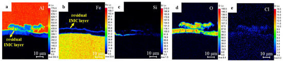 Figure 8 and Figure 9 show the distribution of major alloying elements at position b for the sample after the 480 h salt spray test and position g for the sample after the prolonged 1080 h test in Figure 7, respectively. From Figure 8a,b, the interface Al element region in green coincides with the interface Fe element region in blue, but without the O accumulation in Figure 8d, indicating the IMC layer has not been corroded. Instead, the region enriched in Si, O, and Cl elements near the interface (Figure 8c–e) is in accord with the blue region in the Al nugget in Figure 8a, indicating the preferential corrosion along the interface front rather than at the IMC layer. After the prolonged 1080 salt spray test, the accumulation of Si, O, and Cl (Figure 9c–e) coincided with the blue region of the Al element in Figure 9a. Interestingly, the existence of the IMC layer can still be clearly identified from Figure 9a,b. These corrosion regions in Figure 8 and Figure 9 coincide with the microcracks and Si-enriched region at the interface front in Figure 3, indicating the corrosion development along the microcracks and regions with an enrichment of Si and O near the interface front of Al nugget.