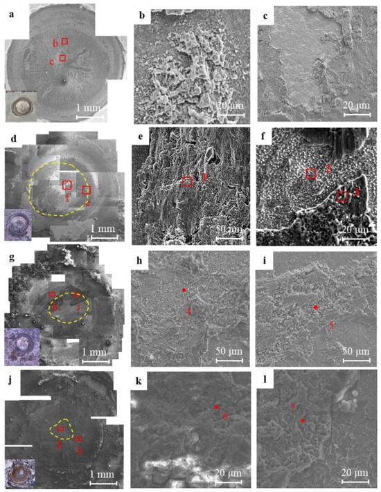 Fracture morphology of 5182/DP780 RSW joint after salt spray exposure of different times (a) macro-morphology without salt spray; (b) micro-morphology at point b; (c) micro-morphology at point c; (d) macro-morphology after exposure of 72 h; (e) micro-morphology at point e; (f) micro-morphology at point f; (g) macro-morphology after exposure of 480 h; (h) micro-morphology at point h; (i) micro-morphology at point i; (j) macro-morphology after exposure of 1080 h; (k) micro-morphology at point k; (l) micro-morphology at point l.