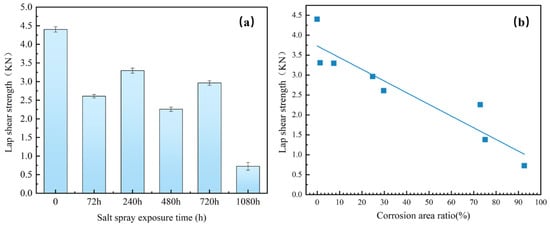Lap shear strengths of the welded joints: (a) relationship between the lap shear strength and salt spray exposure time; (b) relationship between the lap shear strength and the ratio of corrosion area.
