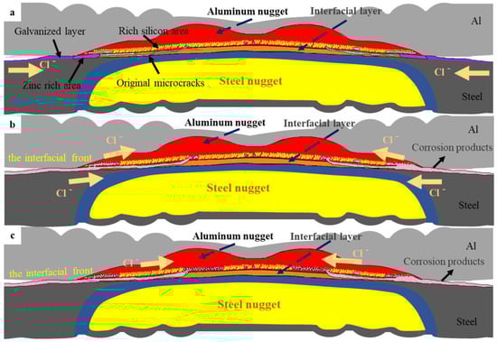 Figure 11 shows the relationship between the maximum tensile shear force and the corrosion area ratio. The shear strength of the joints decreases as the corrosion area of the weld joint increases. The corrosion model of the 5182/DP780 RSW joint after salt spray exposure is formulated in three stages based on the aforementioned findings, referring to Figure 12. During salt spray exposure, chloride attacks the joints. As the sacrificial anode protection, the galvanized layer first undergoes corrosion according to Figure 12a. Then, corrosion appears in the zinc-rich area along the edge of the overlap region. Afterwards, chloride continues to attack through the original microcracks on the interfacial front on the aluminum side, as illustrated in Figure 12b. Additionally, the previously affected region exhibits accumulations of corrosion products. With the prolongation of salt spray exposure time, the corrosion spreads to the front interface of Si enrichment on the aluminum side. Eventually, corrosion further develops along the nugget on the aluminum, according to Figure 12c. The joint corrosion observed in this study exhibits a significant inclination towards Si-rich corrosion. The corrosion on the front interface of the aluminum side degrades the mechanical properties of the joint.