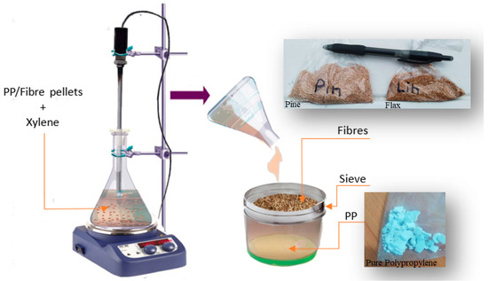 Approximately 20 g of composite pellets were placed in an Erlenmeyer flask containing 150 mL of xylene solution. The mixture was stirred at 1500 rpm and heated to approximately 140 °C until the pellets had completely dissolved. The fibres were then separated from the matrix using a sieve. This procedure was repeated several times until the complete removal of PP from the surface of the fibres. The obtained pine and flax fibres were placed in an oven at 100 °C for several hours until the fibres were completely dry. The separated polypropylene was air-dried.