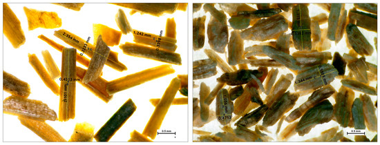 The length-to-diameter ratio (L/D) plays a pivotal role in the mechanical properties of composite materials composed of flax and pine fibres. An optimal L/D ratio enhances the load transfer among components, thereby reinforcing their mechanical attributes. Inadequate values can create weak points, compromising the overall strength of the material. Achieving a precise balance of L/D is essential for optimizing the mechanical performance of composites. Figure 3 displays microscopic images of the fibres, showing L/D values of 4.82 ± 2.76 for flax and 3.17 ± 1.43 for pine.
