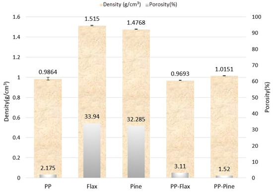 Compared to pure polypropylene PP, which has a density of 0.98 g/cm³ and a porosity of 2%, the composites display variations: PP–flax has a slightly decreased density of 0.96 g/cm³ and an increased porosity of 3%. This suggests potential post-fabrication changes and a higher length-to-diameter (L/D) ratio of the fibres. Conversely, PP–pine exhibits an increased density of 1.01 g/cm³ with a reduced porosity of 1.5%, indicative of more effective fibre integration and a lower L/D ratio for the fibres. These differences not only distinguish each material but also highlight the intricate effects of fibre type, fibre–matrix interactions, and fabrication processes on composites’ properties. This information provides valuable avenues for targeted material design and application-specific research. The densities of PP, pine fibre, and flax fibre align with those reported in previous studies [20,21,22].
