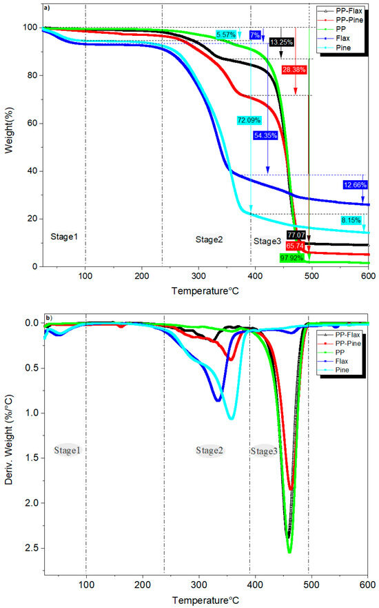 Figure 5a,b illustrate the respective thermogravimetric (TG) curves and first derivatives (DTG) for the composite pellets and their constituents. These curves reveal three distinct stages of thermal change as the temperature increases. The first stage is specifically associated with flax and pine fibres. Up to 100 °C, the decreases in mass by 5.57% and 7% for the pine and flax fibres, respectively, are due to moisture loss, as reported in some works [23,24]. Subsequently, both fibre types maintain thermal stability until reaching 238 °C for flax fibre and 247 °C for pine fibre. This differentiation stems from the higher lignin content in pine fibres, thus retarding the thermal degradation of plant fibres. Manral et al. [25] highlighted that cellulose and hemicellulose degrade because of heat faster than lignin. After the TGA analysis, the char yield was found to be 25.99% for flax fibres and 14.19% for pine fibres, reflecting the differential impact of lignin content on char formation.
