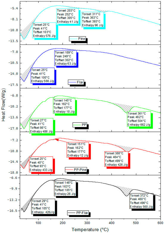 Figure 6 illustrates the DSC curves for flax, pine, PP, PP–pine, and PP–flax, and the analysis results are presented in Table 1. An endothermic peak, observed at temperatures below 105 °C for all samples, is attributed to the evaporation of water present in natural fibres and PP. This peak aligns with the corresponding peak observed in the TG curves, indicating its direct relation to the water content of the samples, which has been further evaluated to understand the effects of post-processing on moisture retention. Notably, the water content tends to be higher in natural fibres than in PP and composites (PP–pine, PP–flax), reflecting variations influenced by the type of fibre, processing, storage conditions, and humidity levels. The three samples containing PP exhibited a peak at 162–163 °C, corresponding to the melting point of the PP. The calculated enthalpy around this peak is notably higher for PP–flax compared to pure PP and PP–pine. The enthalpy of this peak is directly proportional to the fraction of crystallinity of the material, a value calculated using the following equation: