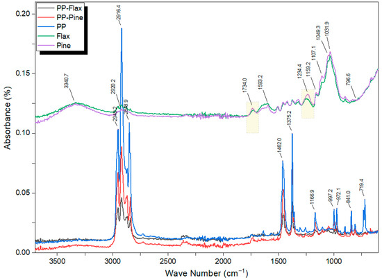 The PP shows higher-intensity absorption bands at 2949 cm−1, 2916 cm−1, 2848 cm−1, 1462 cm−1, 1375 cm−1, 1166 cm−1, 997 cm−1, 972 cm−1, 840 cm−1, and 719 cm−1 than the composites reinforced with flax and pine fibres, indicating a higher content of PP compared to the composite pellets. PP is the most thermoplastic and fusible component of the composites. Additionally, the peaks observed in the curves of the pine and flax fibres do not appear in the case of PP, PP–pine, and PP–flax. Therefore, a good coverage of the flax and pine fibre by the PP matrix is present. The same observation was recorded by Alam et al. [43].